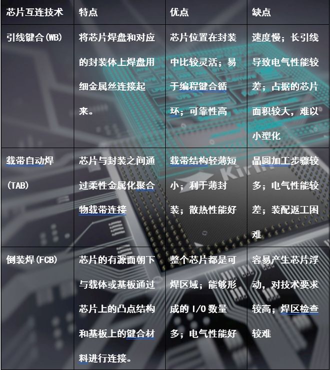 芯片互连技术来自与我们上文提到的零级封装,这是芯片与封装外壳以及外界环境建立联系的关键技术。芯片互连技术主要有三种:引线键合、载带自动焊以及倒装焊。