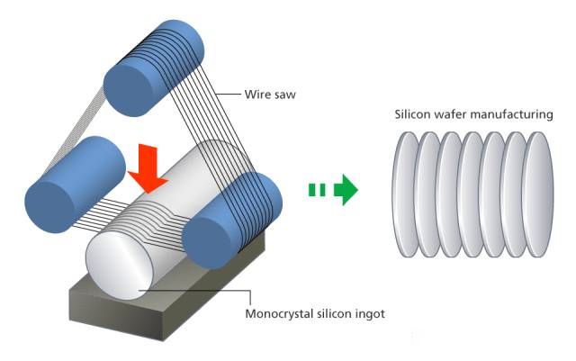 光伏单晶硅的制备过程的前期与芯片单晶硅相同,都是先将高纯硅加热至熔融态,再从中拉出一根单晶硅棒。切片前,光伏硅会先将硅棒切成长方体,这样硅片的横截面就变成方形了。采用方形的原因同样很简单,如果光伏电池是圆形的,多个电池排列成太阳能电池板中间就会出现空隙,降低了整体转化率。