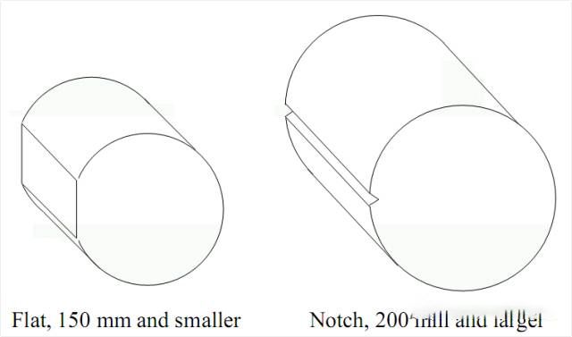 其在硅锭做出来后就要进行。在200mm以下的硅锭上是切割一个平角,叫做Flat。在200mm(含)以上硅锭上,为了减少浪费,只裁剪个圆形小口,叫做Notch。切片后晶圆就变成了这样: